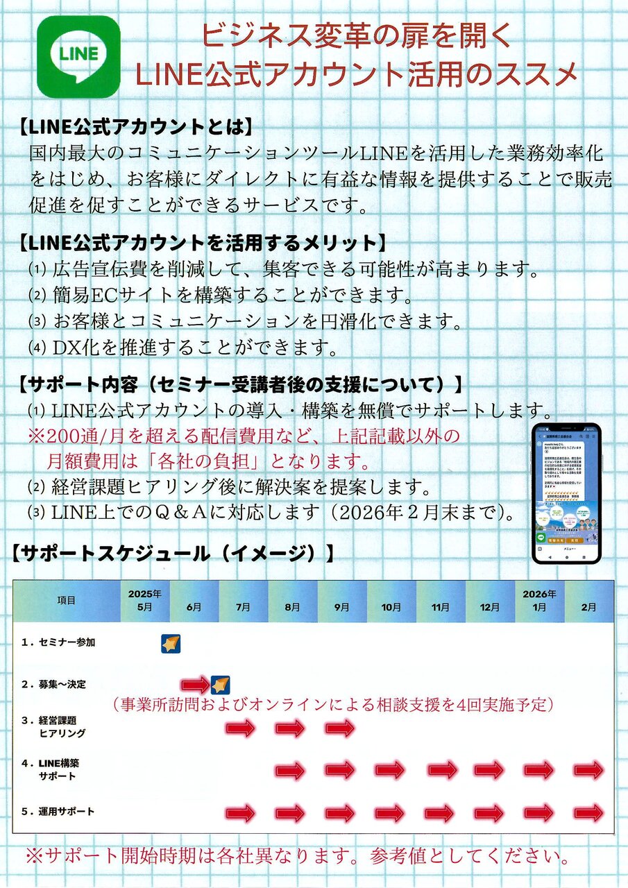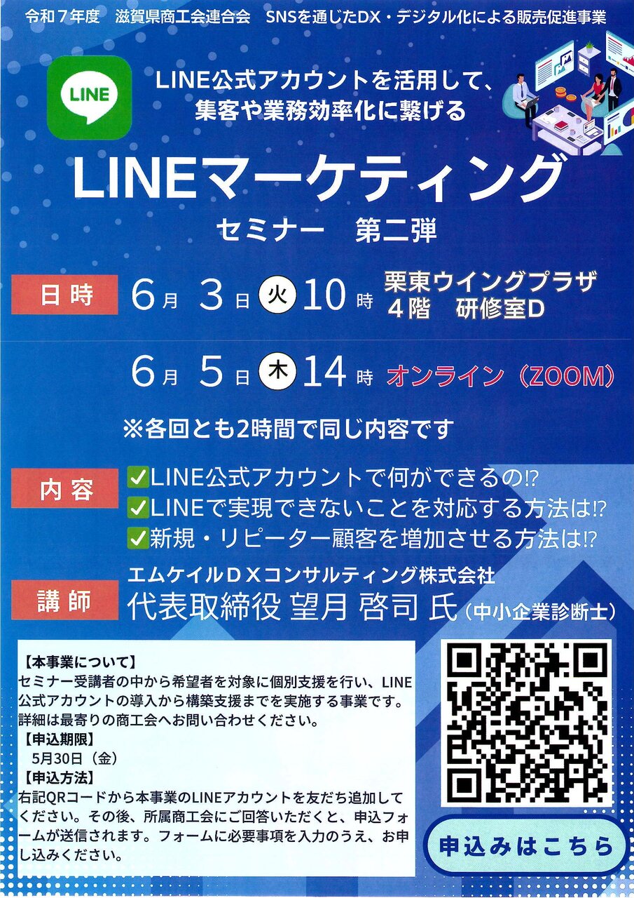 2025年04月22日 LINEマーケティングセミナー 第二弾 【本事業について】 セミナー受講者の中から希望者を対象に個別⽀援を⾏い、LINE 公式アカウントの導⼊から構築⽀援までを実施する事業です。 詳細は最寄りの商⼯会へお問い合わせください。 【申込期限】 5⽉30⽇(⾦) 【申込⽅法】 添付資料のQRコードから本事業のLINEアカウントを友だち追加して ください。その後、所属商⼯会にご回答いただくと、申込フォ ームが送信されます。フォームに必要事項を⼊⼒のうえ、お申 し込みください。 カテゴリなしの他の記事 < 前の記事次の記事 > コメント コメントフォーム 名前 コメント 評価する リセット リセット 顔 星 投稿する 情報を記憶