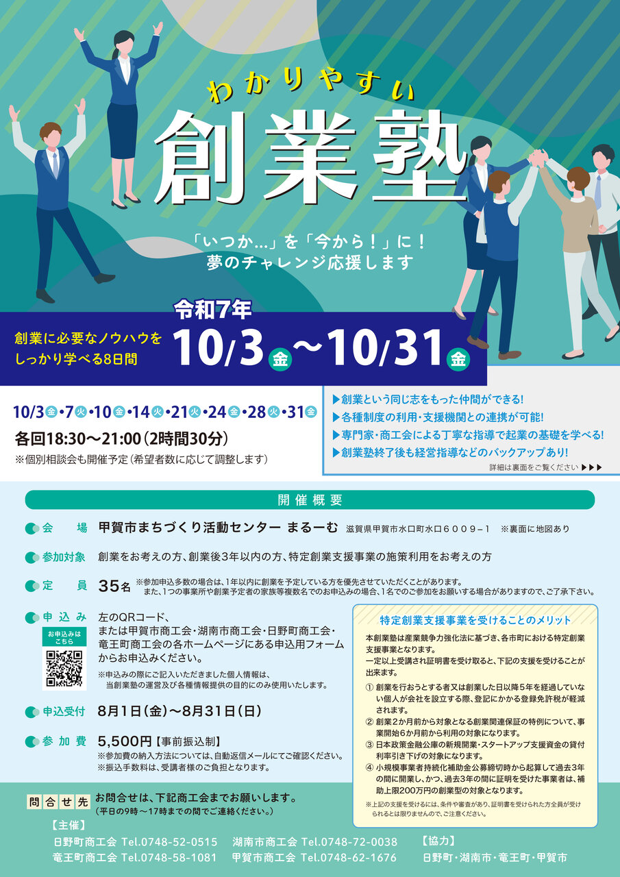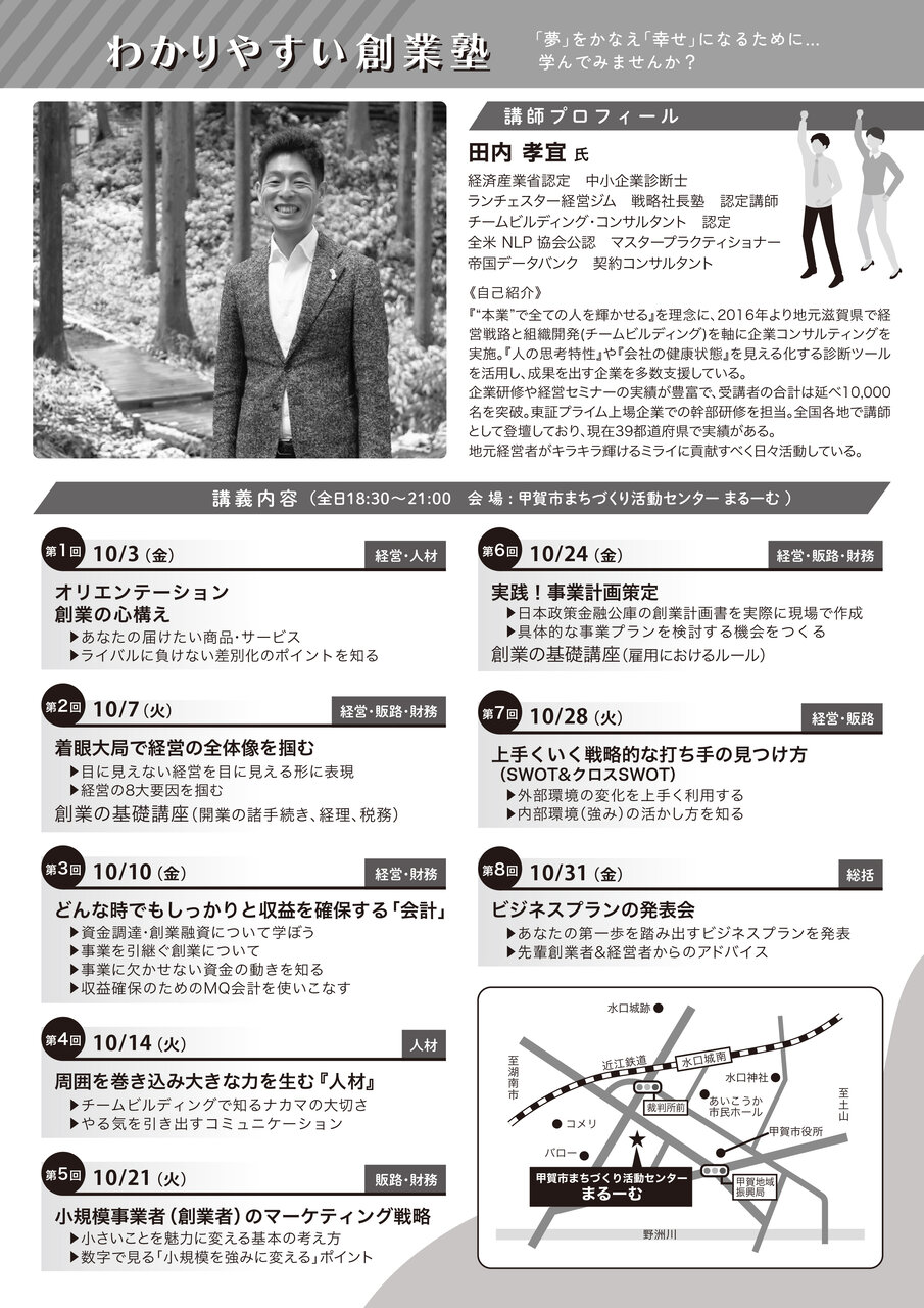甲賀市・湖南市・日野町・竜王町の4つの商工会の主催により「わかりやすい創業塾」を開催致します。