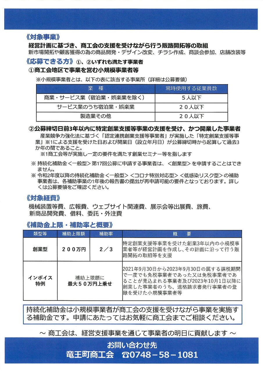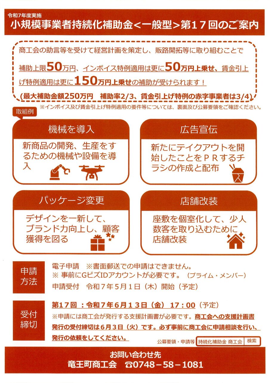 2025年03月18日 令和7年度実施 小規模事業者持続化補助金<一般型><創業型>の公募開始のお知らせ 令和7年度実施 小規模事業者持続化補助金<一般型>第17回、<創業型>第1回の公募が開始されます。詳しくは、下記に添付してあるチラシをご確認ください。
